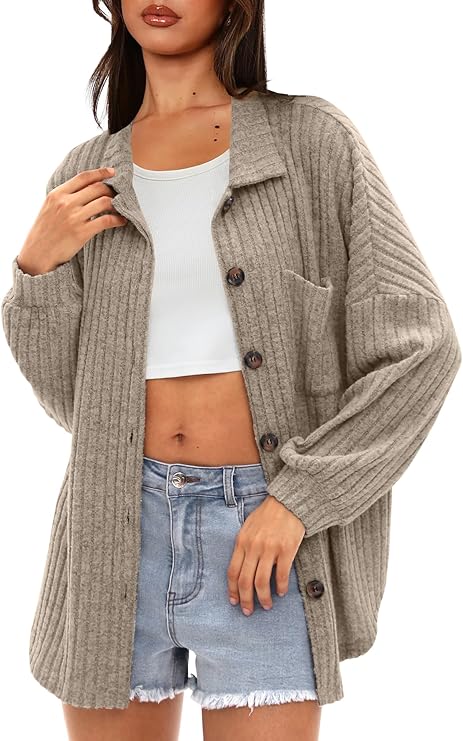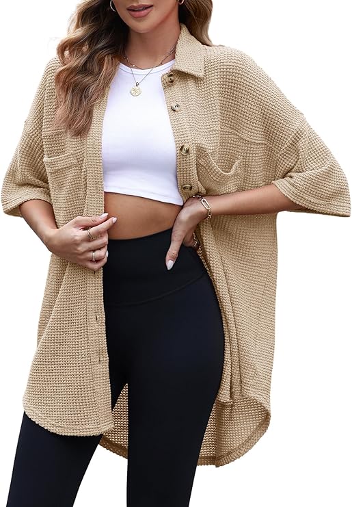 Women's Loose Fit Batwing Sleeve Ribbed Knit Button Down Shirt Shacket Boyfriend Shirt Jackets Tops