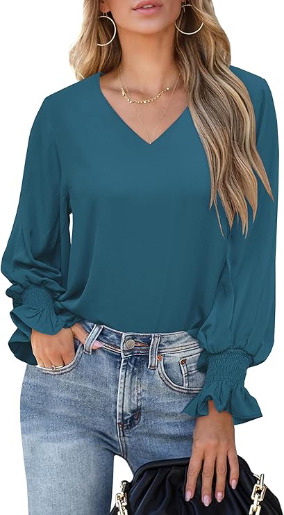Womens Blouses Dressy Casual Tops V Neck Ruffle Balloon Long Sleeve Shirts Elegant Business Casual Outifts