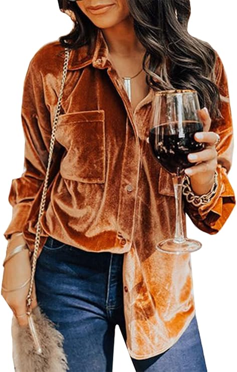 Womens Velvet Long Sleeve Button Down Shirt Jacket Retro Blouse Lapel Tunic Tops