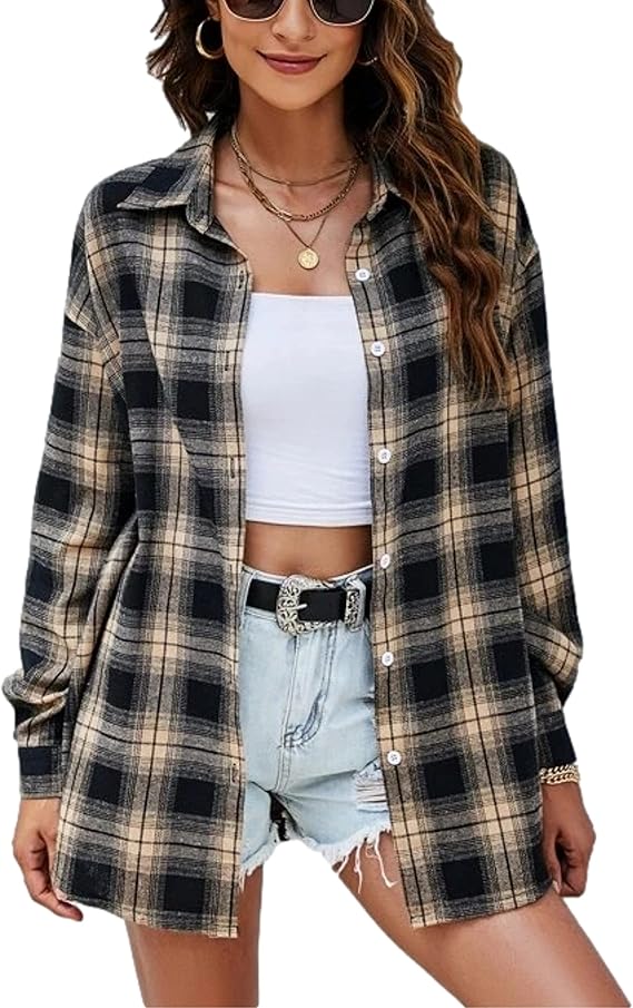 Womens Classic Plaid Shirt Long Sleeve Cotton Button Down Up Shirts Stylish Oversized Loose Fit Blouse V Neck Tops
