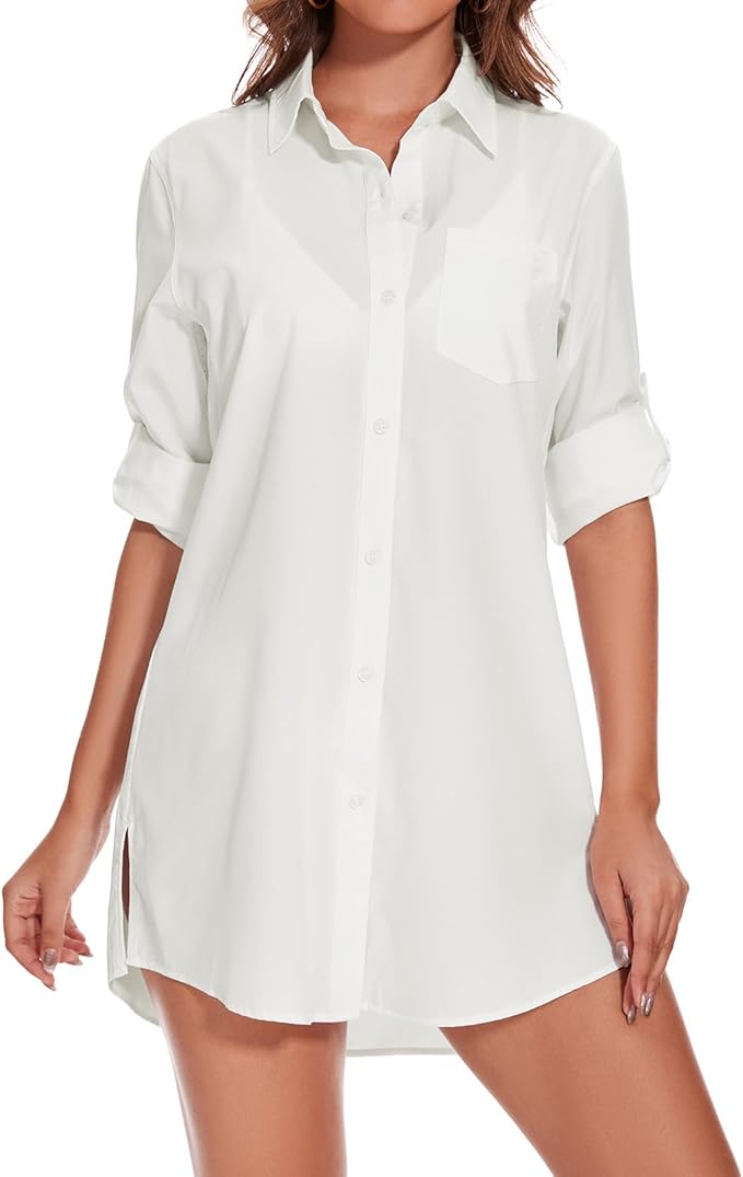 Women’s UPF 50+ Button Down Shirt Dress Collared Long Sleeve Blouse Swimsuit Coverup Boyfriend Shirts Loose Fit