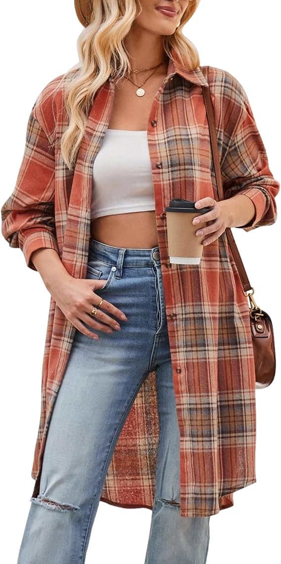 Womens Casual Long Flannel Plaid Shirts Fall Fashion Long Sleeve Boyfriend Coats Jackets with Pockets