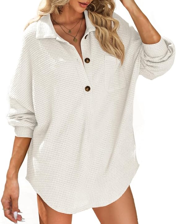 Women Waffle Knit Tops Henley Shirts V Neck Long Sleeve Solid Color Casual Tunics Blouse