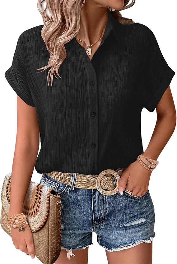 Womens Button Down Shirts Casual Short Sleeve Dress Shirt Textured Collared Summer Work Blouse