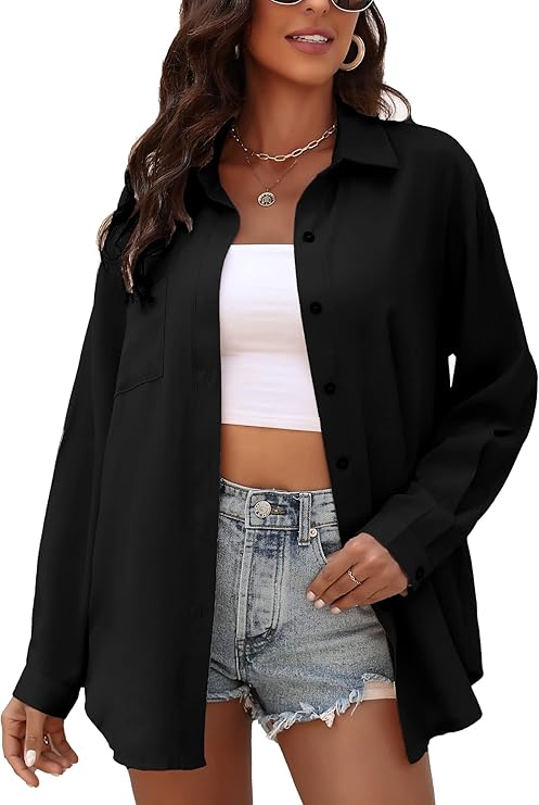 Womens Oversized Button Down Shirts Casual Work Long Sleeve Boyfriend Blouse Dressy Summer Tops