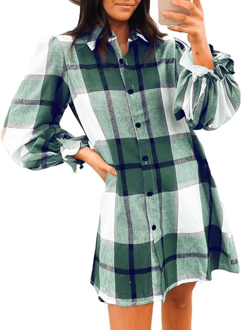 Women's Casual V Neck Loose Fit Long Sleeve Plaid Dress Button Down Shirt Dresses