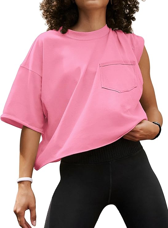 Womens Oversized T-Shirts Short Sleeve Workout Crop Tops Casual Drop Shoulder Boxy Roll Hem Basic Loose Tees