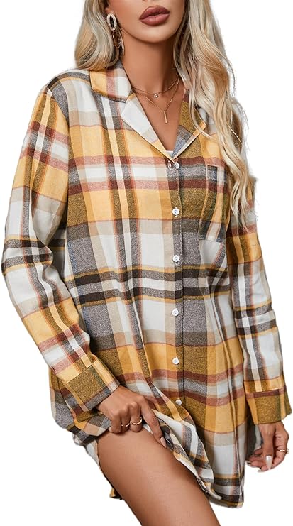 Womens Cotton Nightgowns Button Down Sleepshirt Long Sleeve Plaid Night Shirt Casual Boyfriend Pajamas Dress