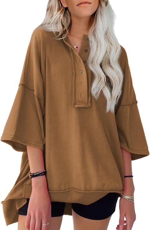 Womens Oversized Short Sleeve Sweatshirt Summer Casual Loose Button Down Henley V Neck Pullover Tunic Tops Shirts