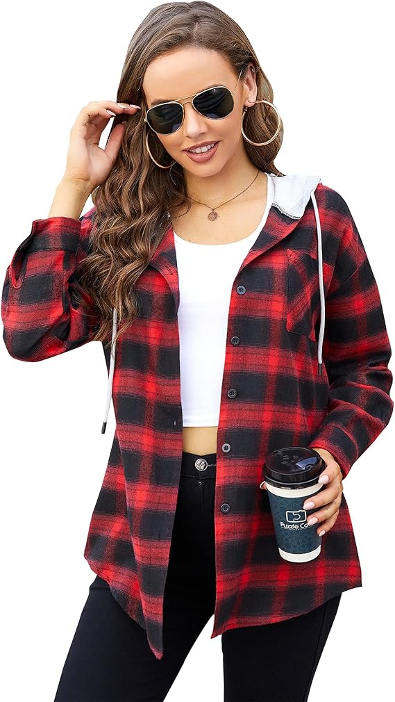 Hooded Flannel Shirt Women Plaid Jacket Shacket Long Sleeve Button Down Blouse Casual Fashion Boyfriend Top Pocketed