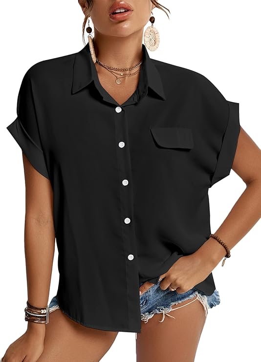 Women's Casual Collared Rolled Up Cap Sleeves Button Down Work Blouse Shirt Tops