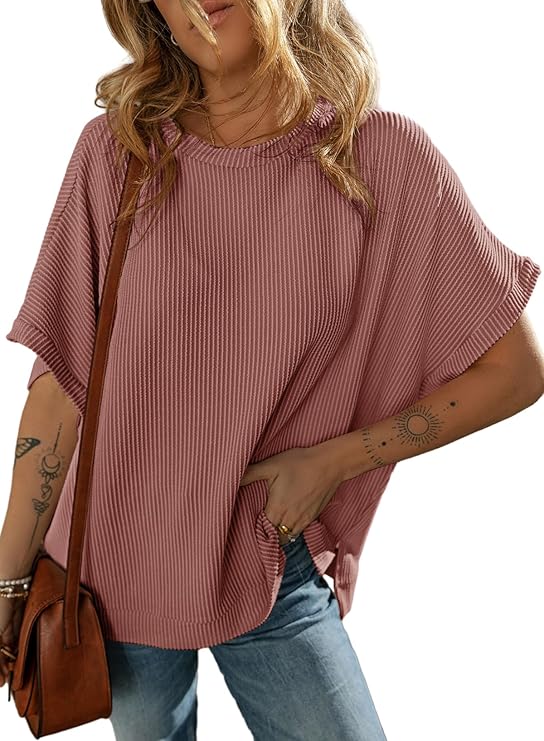 Women's Casual Oversized Short Sleeve Solid Color Loose Texture Knit Tunic Tops Blouses