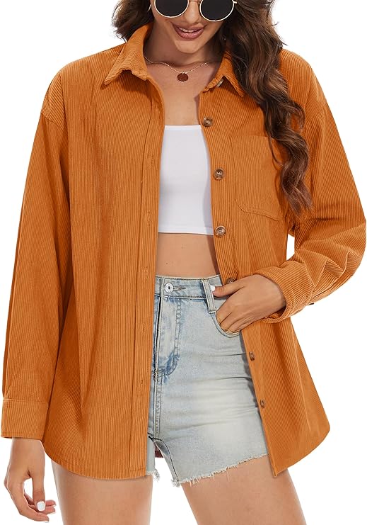 Womens Corduroy Shacket Long Sleeve Button Down Shirt Spring Casual Jacket Bust Pocket Loose Fit Blouse Tops