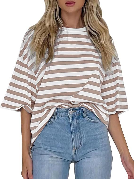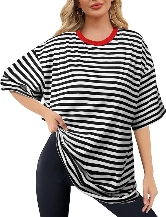 Womens Oversized Striped T Shirts, Color Block Tee Loose Fit Crew Neck Short Sleeve Tops Casual Summer Y2K 2024 Trendy