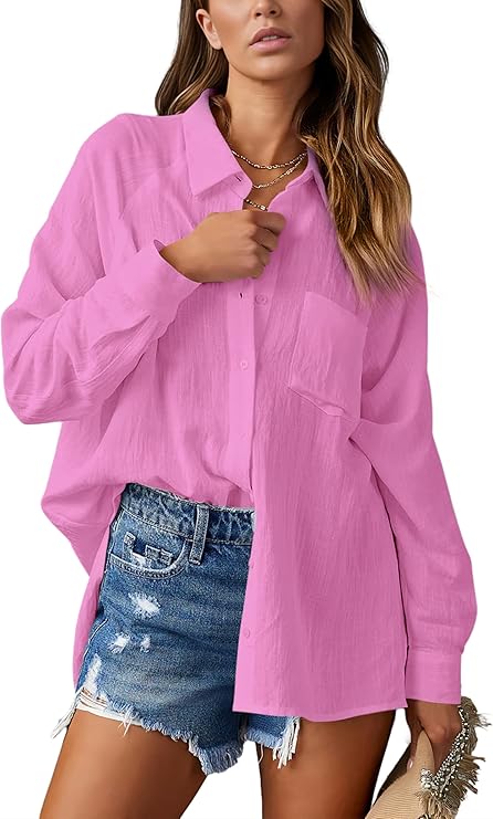 Womens Button Down Shirts Gauze Cotton Dress Shirt Long Sleeve Oversized Boyfriend Solid Tunic Tops with Pockets