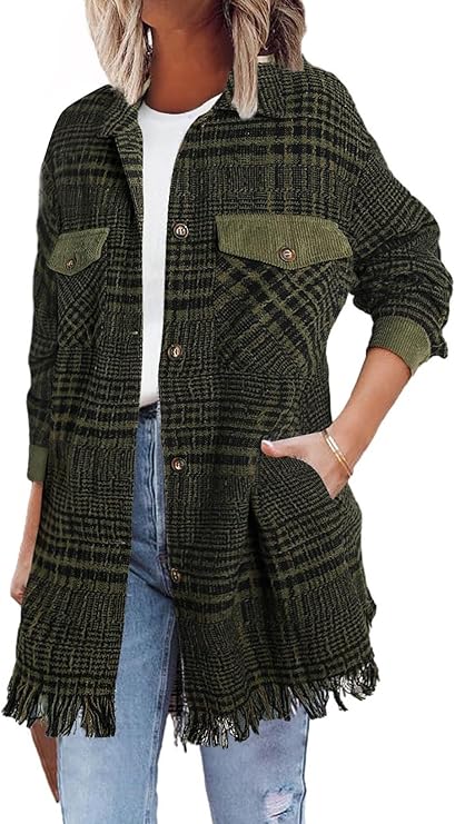 Womens Casual Plaid Shacket Long Sleeve Button Down Oversized Shirt Jacket Coat